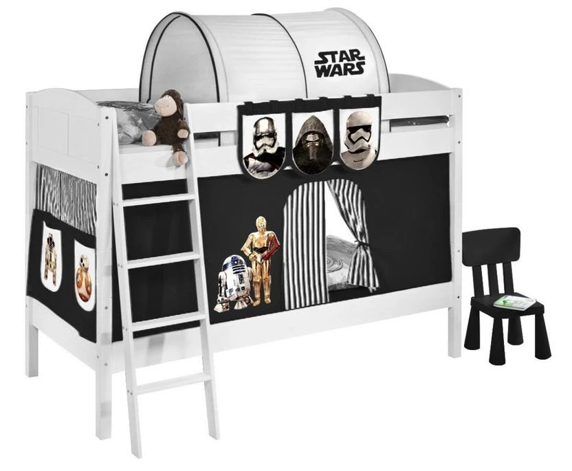 Cette offre comprend uniquement les deux lits superposables avec leurs sommiers et le rideau de couleur noir.